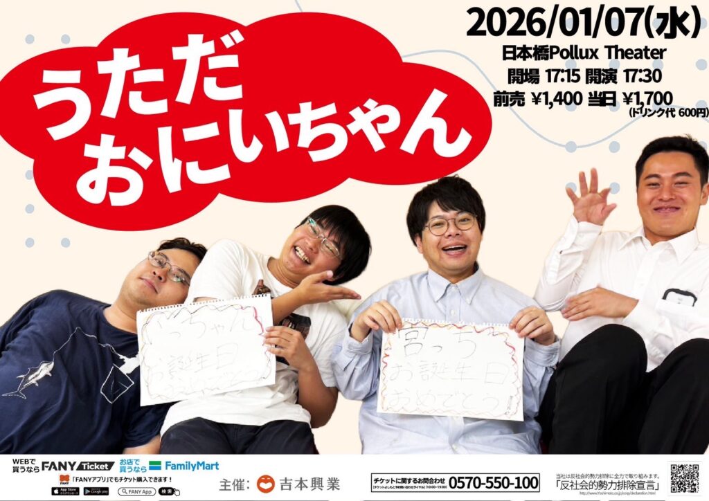 | 2026/01/07(水) 開場 17:15 開演 17:30 うただおにいちゃん 日本橋Pollux Theater(大阪府) 出演 うただ、オニイチャン チケット https://ticket.fany.lol/reception/33323/32012 ・受付開始から先着順でチケットが購入出来ます。予定枚数に達し次第受付終了となります。 ・1回の先着申込で申込可能な公演数は『1公演』、枚数は『10枚まで 』となります。(公演により一部例外がございます) ・座席番号や整理番号は、すべてコンピュータ制御により自動で決定します。 【車いすでご来場のお客様へ】 車いすをご使用の方は、必ず購入前に下記のFANYチケットお問合せ窓口までお問い合わせください。 また、視覚や聴覚等に障がいのある方で特別な配慮を必要とされる方も購入前にお問い合わせください。 ※ご来場時に障がい者手帳等のご提示をお願いする場合がございます。 FANYチケットお問合せダイヤル 0570-550-100(10時~19時/年中無休) FANYチケットお問合せフォーム https://f.msgs.jp/webapp/form/18802_evbb_16/index.do 注意事項 ※ワンドリンク制の為、会場にてチケット代とは別途ドリンク代をお支払い頂きます。 ※5歳以上または身長110cm以上のお子様はお席が必要となります。 ※16歳未満のお客様は、保護者同伴の場合のみ入場可。(終演が19時を越える公演のみ) ※ビデオ・カメラ、または携帯電話等での録音・録画・撮影・配信禁止。 ※出演者は変更になる場合がありますので予めご了承ください。尚、変更にともなう払戻は行いません。 ※迷惑行為や劇場スタッフの指示に従わない場合はご退場頂く場合がございます。 ・出演者は変更になる場合がございます。予めご了承ください。 ・出演者等の変更に伴う払戻しは行いません。 ・購入後の変更・キャンセル(取消し)はできません。 FANYチケット問合せダイヤル 0570-550-100 |