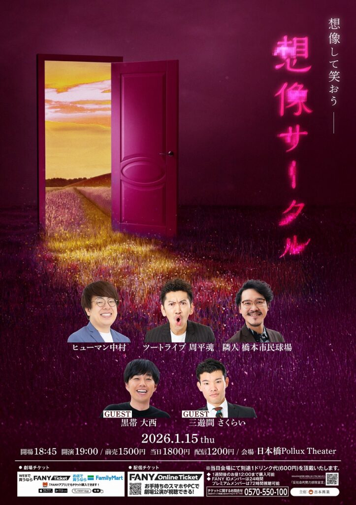 | 2026/01/15(木) 開場 18:45 開演 19:00 想像サークル 日本橋Pollux Theater(大阪府) 出演 隣人・橋本市民球場、ヒューマン中村、ツートライブ周平魂、黒帯大西、三遊間さくらい チケット https://ticket.fany.lol/reception/33624/32313 ——————— ※こちらの公演は有料配信の販売もございます。 ——————— ・受付開始から先着順でチケットが購入出来ます。予定枚数に達し次第受付終了となります。 ・1回の先着申込で申込可能な公演数は『1公演』、枚数は『10枚まで 』となります。(公演により一部例外がございます) ・座席番号や整理番号は、すべてコンピュータ制御により自動で決定します。 【車いすでご来場のお客様へ】 車いすをご使用の方は、必ず購入前に下記のFANYチケットお問合せ窓口までお問い合わせください。 また、視覚や聴覚等に障がいのある方で特別な配慮を必要とされる方も購入前にお問い合わせください。 ※ご来場時に障がい者手帳等のご提示をお願いする場合がございます。 FANYチケットお問合せダイヤル 0570-550-100(10時~19時/年中無休) FANYチケットお問合せフォーム https://f.msgs.jp/webapp/form/18802_evbb_16/index.do 注意事項 ※ワンドリンク制の為、会場にてチケット代とは別途ドリンク代をお支払い頂きます。 ※5歳以上または身長110cm以上のお子様はお席が必要となります。 ※16歳未満のお客様は、保護者同伴の場合のみ入場可。(終演が19時を越える公演のみ) ※ビデオ・カメラ、または携帯電話等での録音・録画・撮影・配信禁止。 ※出演者は変更になる場合がありますので予めご了承ください。尚、変更にともなう払戻は行いません。 ※迷惑行為や劇場スタッフの指示に従わない場合はご退場頂く場合がございます。 ・出演者は変更になる場合がございます。予めご了承ください。 ・出演者等の変更に伴う払戻しは行いません。 ・購入後の変更・キャンセル(取消し)はできません。 FANYチケット問合せダイヤル 0570-550-100 |
