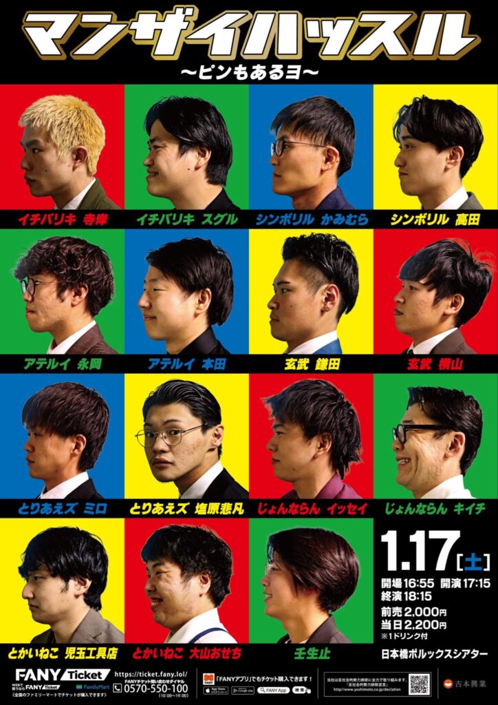 | 2026/01/17(土) 開場 16:55 開演 17:15 マンザイハッスル~ピンもあるヨ~ 日本橋Pollux Theater(大阪府) 出演 アテルイ、イチバリキ、玄武、壬生止、じょんならん、とりあえズ、とかいねこ、シンボリル チケット https://ticket.fany.lol/reception/34800/33228 ・受付開始から先着順でチケットが購入出来ます。予定枚数に達し次第受付終了となります。 ・1回の先着申込で申込可能な公演数は『1公演』、枚数は『10枚まで 』となります。(公演により一部例外がございます) ・座席番号や整理番号は、すべてコンピュータ制御により自動で決定します。 【車いすでご来場のお客様へ】 車いすをご使用の方は、必ず購入前に下記のFANYチケットお問合せ窓口までお問い合わせください。 また、視覚や聴覚等に障がいのある方で特別な配慮を必要とされる方も購入前にお問い合わせください。 ※ご来場時に障がい者手帳等のご提示をお願いする場合がございます。 FANYチケットお問合せダイヤル 0570-550-100(10時~19時/年中無休) FANYチケットお問合せフォーム https://f.msgs.jp/webapp/form/18802_evbb_16/index.do 注意事項 公演名:絶対にウケる(という気持ちで)勝負ネタをした後、絶対に盛り上げる(という気持ちで)コーナーをするライブ ※ドリンク代がチケット代に含まれております。 ※5歳以上または身長110cm以上のお子様はお席が必要となります。 ※16歳未満のお客様は、保護者同伴の場合のみ入場可。(終演が19時を越える公演のみ) ※ビデオ・カメラ、または携帯電話等での録音・録画・撮影・配信禁止。 ※出演者は変更になる場合がありますので予めご了承下さい。尚、変更に伴う払戻しは行いません。 ※迷惑行為や劇場スタッフの指示に従わない場合はご退場頂く場合がございます。 ・出演者は変更になる場合がございます。予めご了承ください。 ・出演者等の変更に伴う払戻しは行いません。 ・購入後の変更・キャンセル(取消し)はできません。 FANYチケット問合せダイヤル 0570-550-100 |