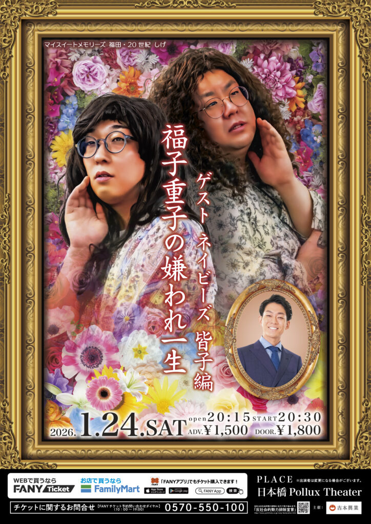| 2026/01/24(土) 開場 20:15 開演 20:30 福子重子の嫌われ一生 ゲストネイビーズ皆子編 日本橋Pollux Theater(大阪府) 出演 マイスイートメモリーズ福田、20世紀しげ、ネイビーズアフロみながわ チケット https://ticket.fany.lol/reception/36255/33690 ・受付開始から先着順でチケットが購入出来ます。予定枚数に達し次第受付終了となります。 ・1回の先着申込で申込可能な公演数は『1公演』、枚数は『10枚まで 』となります。(公演により一部例外がございます) ・座席番号や整理番号は、すべてコンピュータ制御により自動で決定します。 【車いすでご来場のお客様へ】 車いすをご使用の方は、必ず購入前に下記のFANYチケットお問合せ窓口までお問い合わせください。 また、視覚や聴覚等に障がいのある方で特別な配慮を必要とされる方も購入前にお問い合わせください。 ※ご来場時に障がい者手帳等のご提示をお願いする場合がございます。 FANYチケットお問合せダイヤル 0570-550-100(10時~19時/年中無休) FANYチケットお問合せフォーム https://f.msgs.jp/webapp/form/18802_evbb_16/index.do 注意事項 ※ワンドリンク制の為、会場にてチケット代とは別途ドリンク代をお支払い頂きます。 ※5歳以上または身長110cm以上のお子様はお席が必要となります。 ※16歳未満のお客様は、保護者同伴の場合のみ入場可。(終演が19時を越える公演のみ) ※ビデオ・カメラ、または携帯電話等での録音・録画・撮影・配信禁止。 ※出演者は変更になる場合がありますので予めご了承ください。尚、変更にともなう払戻は行いません。 ※迷惑行為や劇場スタッフの指示に従わない場合はご退場頂く場合がございます。 ・出演者は変更になる場合がございます。予めご了承ください。 ・出演者等の変更に伴う払戻しは行いません。 ・購入後の変更・キャンセル(取消し)はできません。 FANYチケット問合せダイヤル 0570-550-100 |