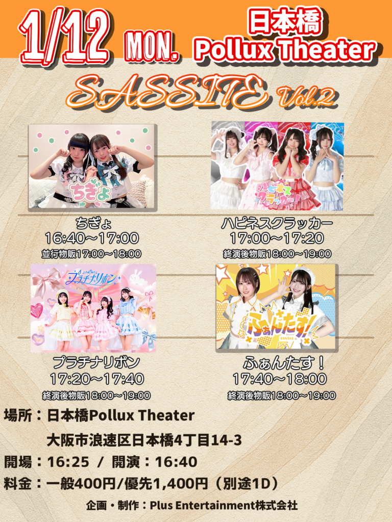 | 『SASSITE』 場所:日本橋Pollux Theater 日程:1/12(月祝) 時間:16:25OPEN/16:40START 料金:一般400/前方優先1,400円 https://tiget.net/events/458215 出演:ふぁんたす!、ちぎょ、ハピネスクラッカー!、プラチナリボン ※優先、一般ともに当日払い ※入場順 優先→一般→当日 ※優先エリアあり ~~~~~~~~~~~~~~~~~~~~~~~~~~~~ <注意事項> ・情勢によって、イベント時間などが変更になる可能性がありますが、その際のチケットの払い戻しは出来兼ねますので予めご了承ください。 ・入場時および、特典会はスタッフの誘導に必ずしたがってください。 スタッフからのお声がけにしたがっていただけない場合は退場となります。 ・荷物を置くなどしての場所取り行為を禁止とさせて頂きます。 ・泥酔した状態や周りのお客様への迷惑行為があった場合は即退出いただきます。 ・特典会ではお客様からの接触行為は禁止となります。 |
