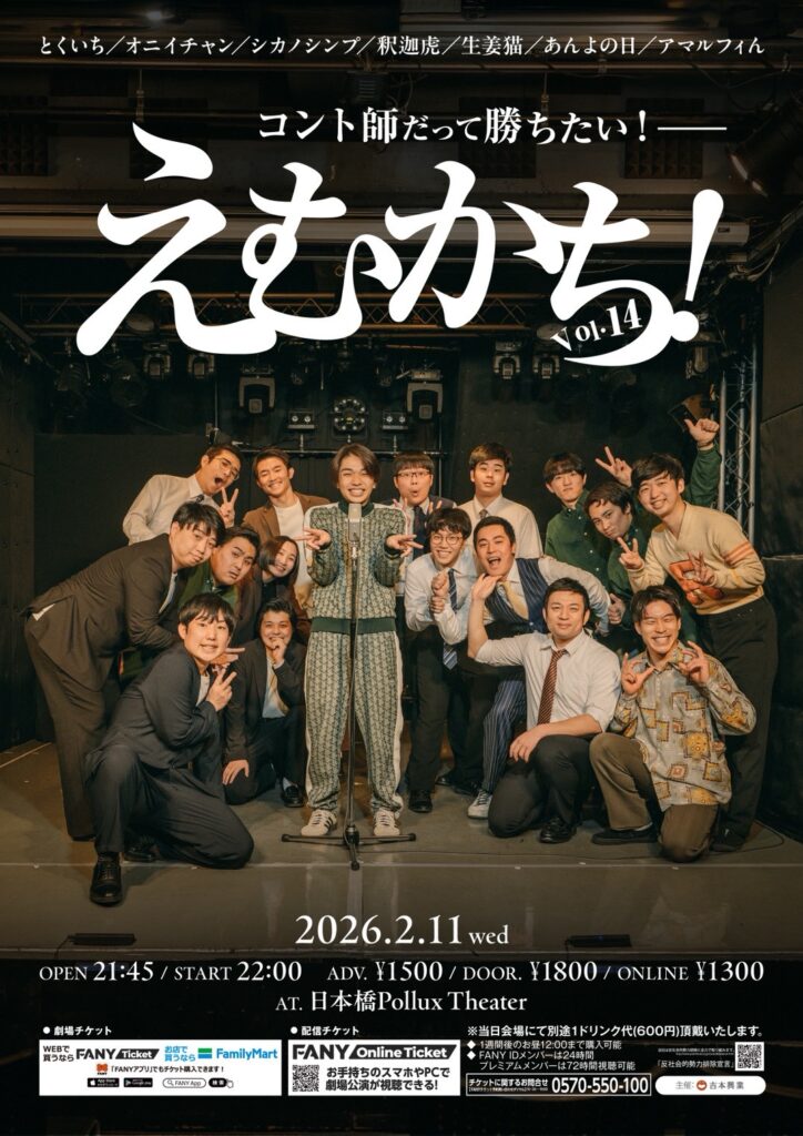 | 2026/02/11(水・祝) 開場 21:45 開演 22:00 えむかちvol14 日本橋Pollux Theater(大阪府) 出演 とくいち、オニイチャン、シカノシンプ、釈迦虎、生姜猫、あんよの日、アマルフィん チケット https://ticket.fany.lol/reception/36376/33776 ——————— ※こちらの公演は有料配信の販売もございます。 ——————— ・受付開始から先着順でチケットが購入出来ます。予定枚数に達し次第受付終了となります。 ・1回の先着申込で申込可能な公演数は『1公演』、枚数は『10枚まで』となります。(公演により一部例外がございます) ・座席番号や整理番号は、すべてコンピュータ制御により自動で決定します。 【車いすでご来場のお客様へ】 車いすをご使用の方は、必ず購入前に下記のFANYチケットお問合せ窓口までお問い合わせください。 また、視覚や聴覚等に障がいのある方で特別な配慮を必要とされる方も購入前にお問い合わせください。 ※ご来場時に障がい者手帳等のご提示をお願いする場合がございます。 FANYチケットお問合せダイヤル 0570-550-100(10時~19時/年中無休) FANYチケットお問合せフォーム https://f.msgs.jp/webapp/form/18802_evbb_16/index.do 注意事項 ※ワンドリンク制の為、会場にてチケット代とは別途ドリンク代をお支払い頂きます。 ※5歳以上または身長110cm以上のお子様はお席が必要となります。 ※16歳未満のお客様は、保護者同伴の場合のみ入場可。(終演が19時を越える公演のみ) ※ビデオ・カメラ、または携帯電話等での録音・録画・撮影・配信禁止。 ※出演者は変更になる場合がありますので予めご了承ください。尚、変更にともなう払戻は行いません。 ※迷惑行為や劇場スタッフの指示に従わない場合はご退場頂く場合がございます。 ・出演者は変更になる場合がございます。予めご了承ください。 ・出演者等の変更に伴う払戻しは行いません。 ・購入後の変更・キャンセル(取消し)はできません。 FANYチケット問合せダイヤル 0570-550-100 |