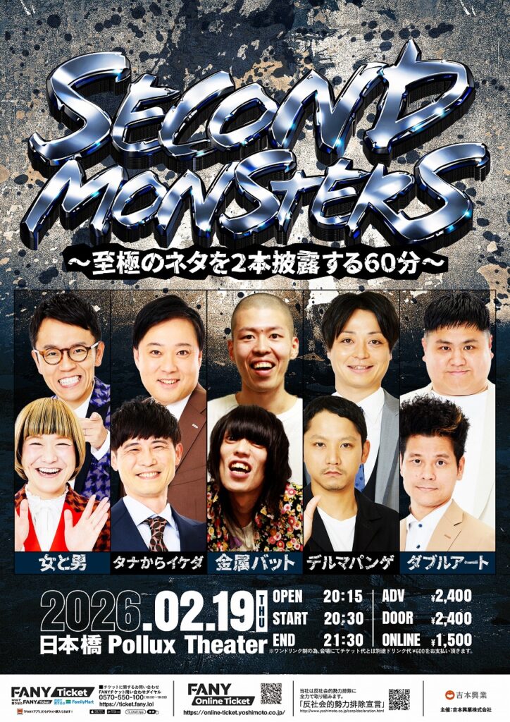 | 2026/02/19(木) 開場 20:15 開演 20:30 SECOND MONSTERS~至極のネタ2本の60分~ 日本橋Pollux Theater(大阪府) 出演 女と男、タナからイケダ、金属バット、ダブルアート、デルマパンゲ チケット https://ticket.fany.lol/reception/36391/33733 ——————— ※こちらの公演は有料配信の販売もございます。 ——————— ・受付開始から先着順でチケットが購入出来ます。予定枚数に達し次第受付終了となります。 ・1回の先着申込で申込可能な公演数は『1公演』、枚数は『10枚まで』となります。(公演により一部例外がございます) ・座席番号や整理番号は、すべてコンピュータ制御により自動で決定します。 【車いすでご来場のお客様へ】 車いすをご使用の方は、必ず購入前に下記のFANYチケットお問合せ窓口までお問い合わせください。 また、視覚や聴覚等に障がいのある方で特別な配慮を必要とされる方も購入前にお問い合わせください。 ※ご来場時に障がい者手帳等のご提示をお願いする場合がございます。 FANYチケットお問合せダイヤル 0570-550-100(10時~19時/年中無休) FANYチケットお問合せフォーム https://f.msgs.jp/webapp/form/18802_evbb_16/index.do 注意事項 ※ワンドリンク制の為、会場にてチケット代とは別途ドリンク代をお支払い頂きます。 ※5歳以上または身長110cm以上のお子様はお席が必要となります。 ※16歳未満のお客様は、保護者同伴の場合のみ入場可。(終演が19時を越える公演のみ) ※ビデオ・カメラ、または携帯電話等での録音・録画・撮影・配信禁止。 ※出演者は変更になる場合がありますので予めご了承ください。尚、変更にともなう払戻は行いません。 ※迷惑行為や劇場スタッフの指示に従わない場合はご退場頂く場合がございます。 ・出演者は変更になる場合がございます。予めご了承ください。 ・出演者等の変更に伴う払戻しは行いません。 ・購入後の変更・キャンセル(取消し)はできません。 FANYチケット問合せダイヤル 0570-550-100 |