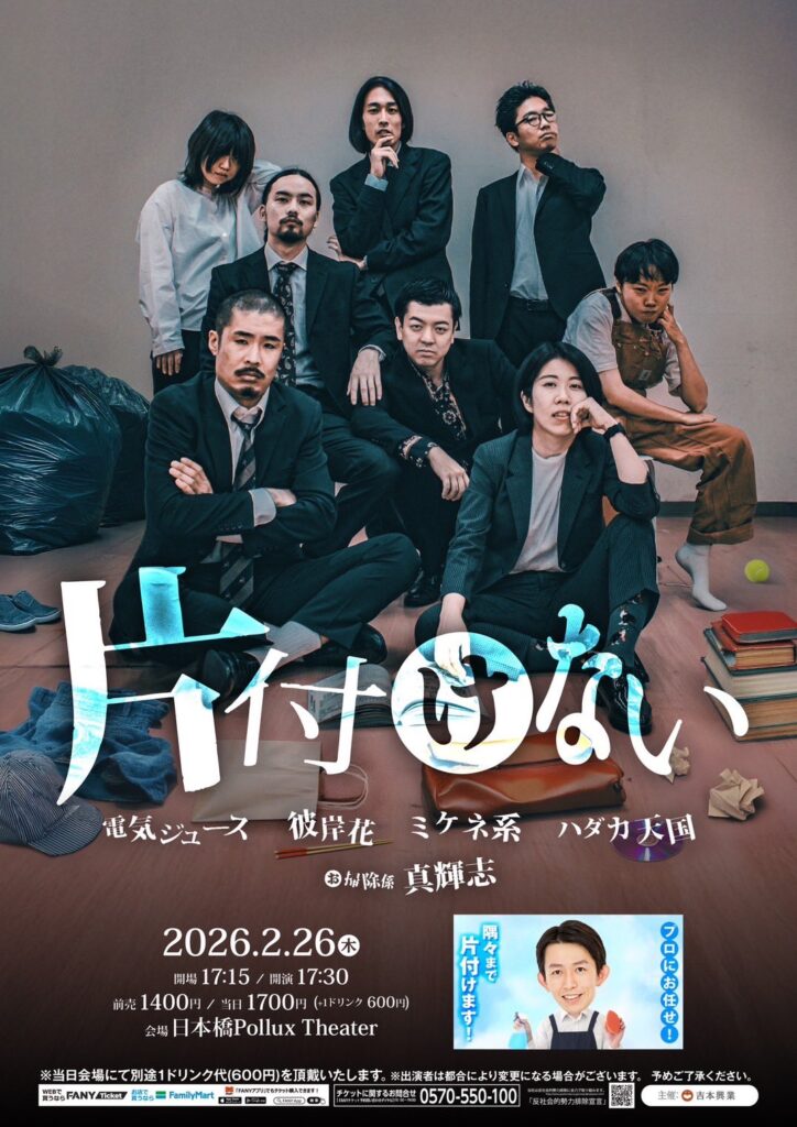 | 2026/02/26(木) 開場 17:15 開演 17:30 片付けない 日本橋Pollux Theater(大阪府) 出演 電気ジュース、ミケネ系、ハダカ天国、彼岸花、真輝志 チケット https://ticket.fany.lol/reception/36401/33753 ・受付開始から先着順でチケットが購入出来ます。予定枚数に達し次第受付終了となります。 ・1回の先着申込で申込可能な公演数は『1公演』、枚数は『10枚まで』となります。(公演により一部例外がございます) ・座席番号や整理番号は、すべてコンピュータ制御により自動で決定します。 【車いすでご来場のお客様へ】 車いすをご使用の方は、必ず購入前に下記のFANYチケットお問合せ窓口までお問い合わせください。 また、視覚や聴覚等に障がいのある方で特別な配慮を必要とされる方も購入前にお問い合わせください。 ※ご来場時に障がい者手帳等のご提示をお願いする場合がございます。 FANYチケットお問合せダイヤル 0570-550-100(10時~19時/年中無休) FANYチケットお問合せフォーム https://f.msgs.jp/webapp/form/18802_evbb_16/index.do 注意事項 ※ワンドリンク制の為、会場にてチケット代とは別途ドリンク代をお支払い頂きます。 ※5歳以上または身長110cm以上のお子様はお席が必要となります。 ※16歳未満のお客様は、保護者同伴の場合のみ入場可。(終演が19時を越える公演のみ) ※ビデオ・カメラ、または携帯電話等での録音・録画・撮影・配信禁止。 ※出演者は変更になる場合がありますので予めご了承ください。尚、変更にともなう払戻は行いません。 ※迷惑行為や劇場スタッフの指示に従わない場合はご退場頂く場合がございます。 ・出演者は変更になる場合がございます。予めご了承ください。 ・出演者等の変更に伴う払戻しは行いません。 ・購入後の変更・キャンセル(取消し)はできません。 FANYチケット問合せダイヤル 0570-550-100 |