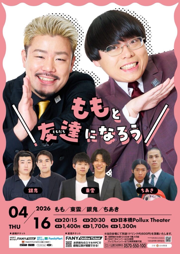 | 2026/04/16(木) 開場 20:15 開演 20:30 ももと友達になろう 日本橋Pollux Theater(大阪府) 出演 もも 東雲 銀鬼 ちあき チケット https://ticket.fany.lol/reception/44246/38529 ——————— ※こちらの公演は有料配信の販売もございます。 ——————— ・受付開始から先着順でチケットが購入出来ます。予定枚数に達し次第受付終了となります。 ・1回の先着申込で申込可能な公演数は『1公演』、枚数は『10枚まで』となります。(公演により一部例外がございます) ・座席番号や整理番号は、すべてコンピュータ制御により自動で決定します。 【車いすでご来場のお客様へ】 車いすをご使用の方は、必ず購入前に下記のFANYチケットお問合せ窓口までお問い合わせください。 また、視覚や聴覚等に障がいのある方で特別な配慮を必要とされる方も購入前にお問い合わせください。 ※ご来場時に障がい者手帳等のご提示をお願いする場合がございます。 FANYチケットお問合せダイヤル 0570-550-100(10時~19時/年中無休) FANYチケットお問合せフォーム https://f.msgs.jp/webapp/form/18802_evbb_16/index.do 注意事項 ※ワンドリンク制の為、会場にてチケット代とは別途ドリンク代をお支払い頂きます。 ※5歳以上または身長110cm以上のお子様はお席が必要となります。 ※16歳未満のお客様は、保護者同伴の場合のみ入場可。(終演が19時を越える公演のみ) ※ビデオ・カメラ、または携帯電話等での録音・録画・撮影・配信禁止。 ※出演者は変更になる場合がありますので予めご了承ください。尚、変更にともなう払戻は行いません。 ※迷惑行為や劇場スタッフの指示に従わない場合はご退場頂く場合がございます。 ・出演者は変更になる場合がございます。予めご了承ください。 ・出演者等の変更に伴う払戻しは行いません。 ・購入後の変更・キャンセル(取消し)はできません。 FANYチケット問合せダイヤル 0570-550-100 |